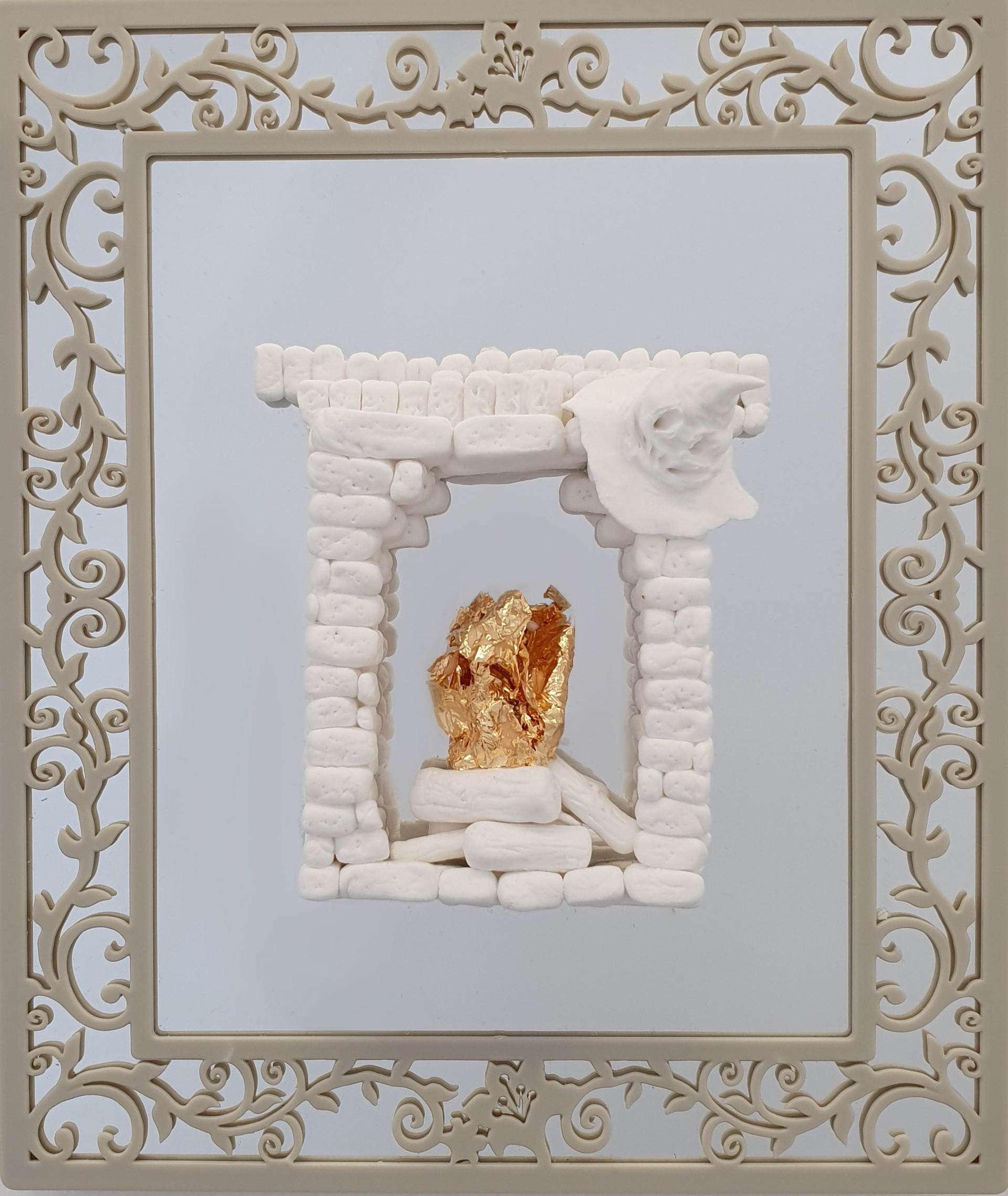 polystyrene, acrylic/glass/mirror, LIGHTWEIGHT clay, gold flakes, lace